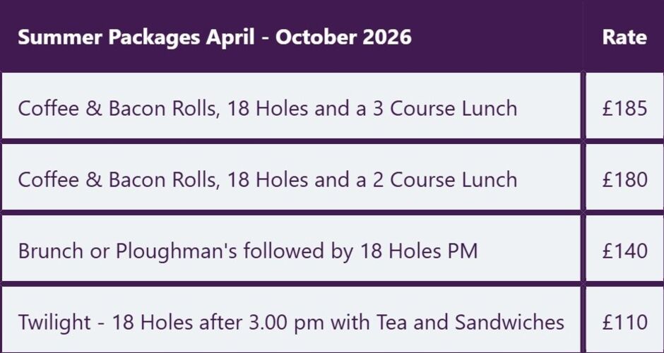 Our days for group bookings are Tuesdays and Thursdays with the full list of packages as shown. Our chef uses fresh seasonal ingredients, from carefully sourced suppliers and beside the tradition carvery meals they are happy to offer a wide selection of varied meals to make your golf day extra special. We are happy to discuss menu options and dietary requests will always be catered for when known in advance.